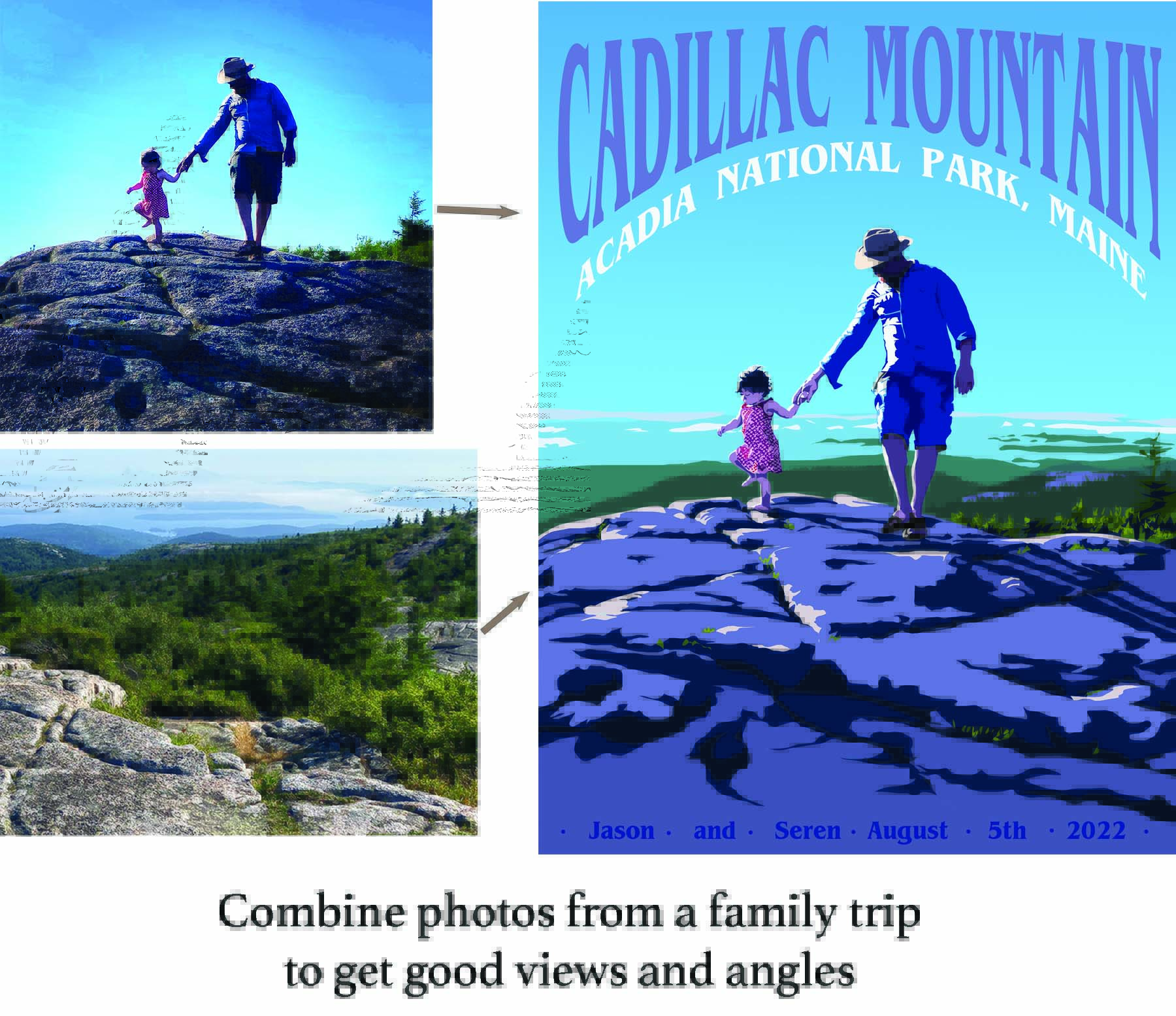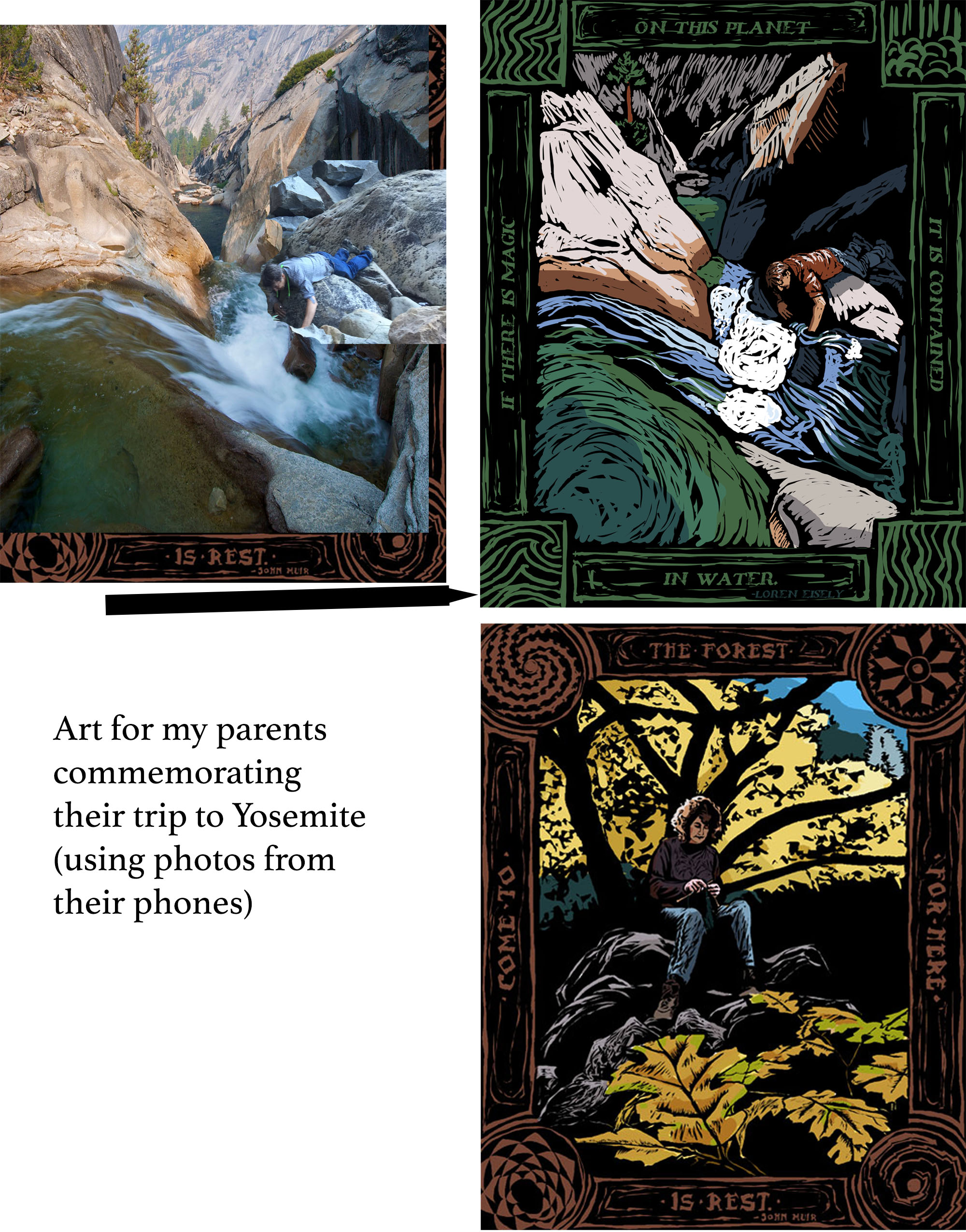 I'm currently offering custom art created from the client's photos or descriptions. In the past, I've drawn several pieces using someone's personal photos, ideas, and descriptions of a special place, person, and/or memory. For example, for my parents I made a woodcut-style drawing of each of them doing one of their favorite activities in Yosemite--my mom knitting in an autumn forest and my dad laying on High Sierra rocks playing with creek water--combined with a quote I knew they liked about the activity. For my parents-in-law, I took a photo of them playing with their granddaughter on the couch and made it look like they were sitting in one of their favorite parks while doing it, in a style that looked more like an old poster. I also made a drawing of my husband and our daughter playing in Maine, using a couple of photos to get good scenery and making a title as though it was a travel poster. (See examples on this page).